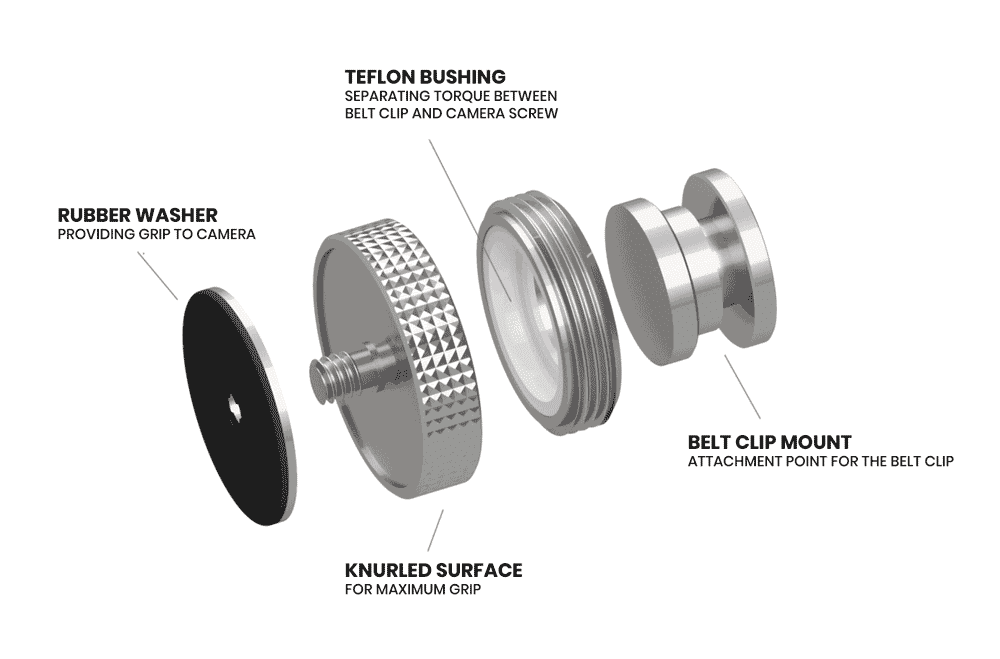 …For lack of a better word. Keeping your gear safe is our number one concern and the camera mount has a clever design that isolates the twists and torque generated by the Belt clip from the screw that goes into your camera. So you and your camera can swing all you want, it wont come loose!